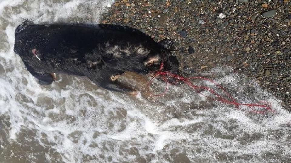 Ereğli-Alaplı ilçeleri arasındaki sahilde denize girenler kıyıya vurmuş köpek ölüsüyle karşılaştı. Köpeğin boğazının ise iple bağlandığı görüldü.