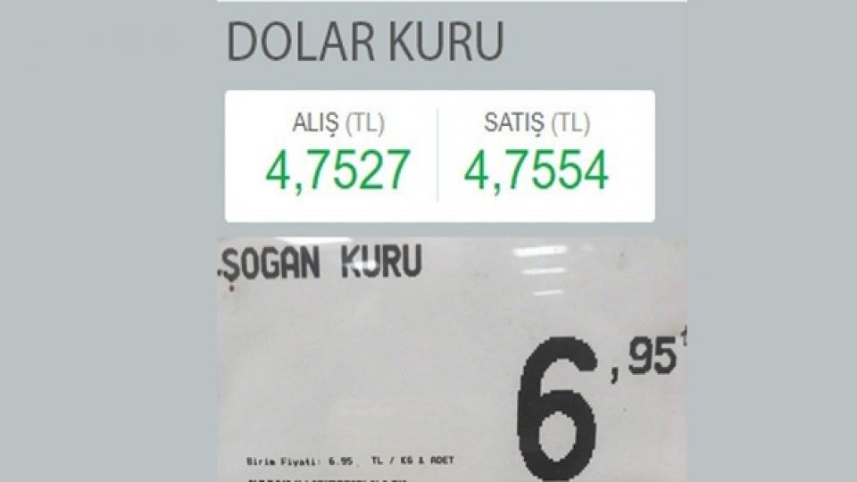 Dolar kurunun 4.75 olduğu görselle kuru soğanın 6.95 olduğu görselleri kolajlayan Karamollaoğlu, tweet'ine "Dolar kuru: 4.75, Soğan kuru: 6.95" notunu düştü.