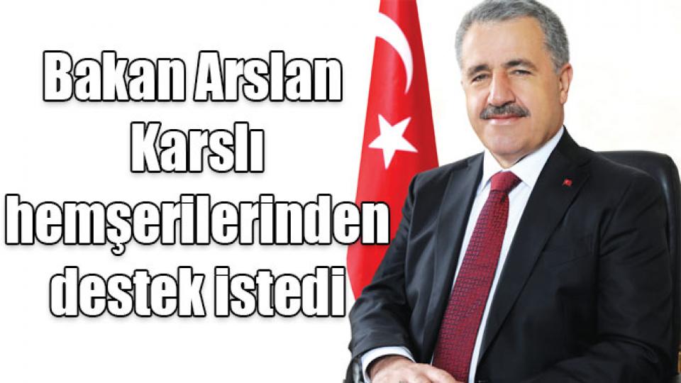 Kars'ın bir evladı olarak tüm Karslı hemşerilerinden destek isteyen Bakan Arslan, "Birlik, bütünlük ve Tek Türkiye için, dev projelerin devamı için, Kars’a yapılan yatırımların tamamlanması, ihtiyaç olan yeni yatırımların başlatılması için, Ankara’ya eli dolu güçlü gitmem için Kars’ın bir evladı olarak, tüm Karslı hemşerilerimden destek istiyorum." dedi.