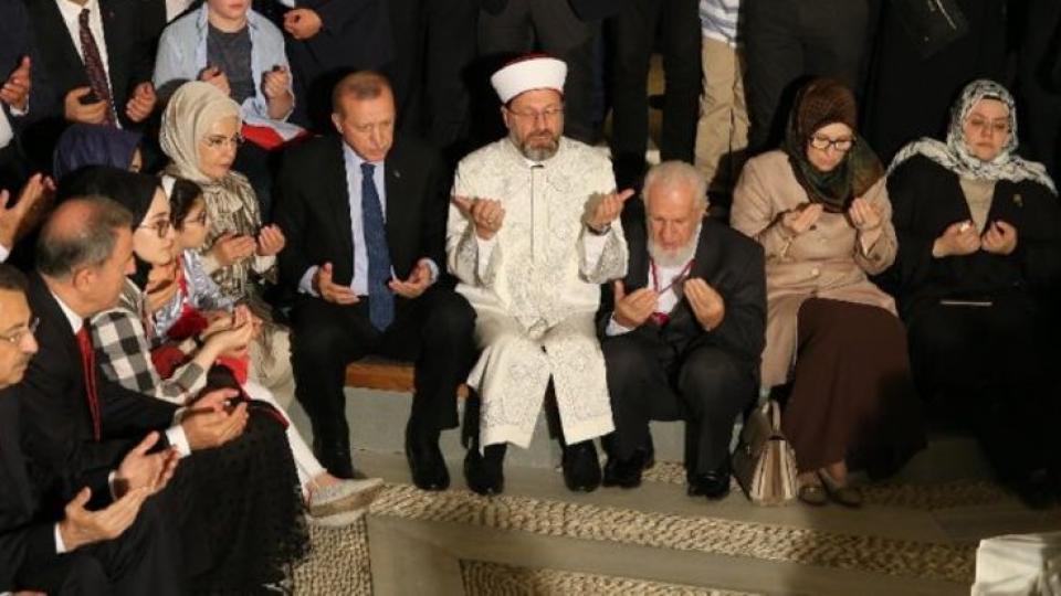Aynı tablo akşam 21.00’da bu defa Köprü üzerindeki etkinlikte gözlerimizin önündeydi. Erdoğan yine yanı başına oturttuğu Diyanet Başkanı’nın okuduğu Kur’an’ı eşi ve torunları ile birlikte dinledi, dualara âmin dedi.
