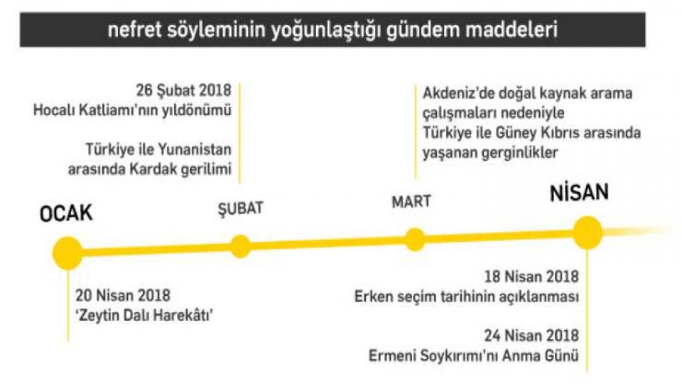 Raporda ilk dört ayda ulusal, etnik ve dini grupları hedef alan 2 bin 265 köşe yazısı ve haber tespit edildi. Bazı yazılarda birden fazla gruba yönelik nefret söylemi yer aldı. Tüm yazılarda 3 bin 76 nefret söylemine rastlandı.