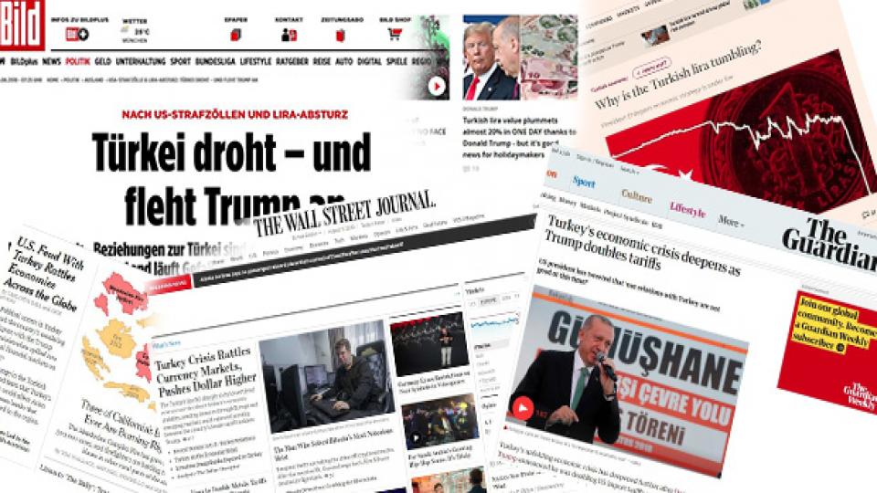 ABD ile Türkiye arasında diplomatik olarak başlayıp kısa süre içerisindde Türk Lirası'nın rekor oranlarda değer kaybederek ekonomik bir krize dönüşmesi dünya basınında geniş yer buldu. Uluslararası kamuoyu Türkiye'deki ekonomik gelişmeleri dikkat ve endişe ile izlerken, İngiliz basını, ABD Başkanı Donald Trump'a teşekkür etti. İngiltere'de yayın yapan The Guardian gazetesinde, "Trump sağolsun TL değer kaybetti, bu İngiliz tatilciler için iyi haber" yorumu yapıldı.