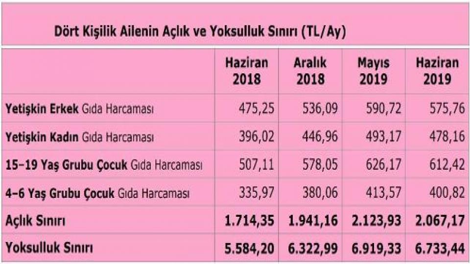 Türkiye İşçi Sendikaları Konfederasyonu (TÜRK-İŞ), Haziran ayı açlık ve yoksulluk sınırı araştırmasına göre, dört kişilik ailenin açlık sınırı 2,067 lira, yoksulluk sınırı 6,733 lira, evli olmayan-çocuksuz bir çalışanın “yaşama maliyeti” ise 2,559 lira oldu.