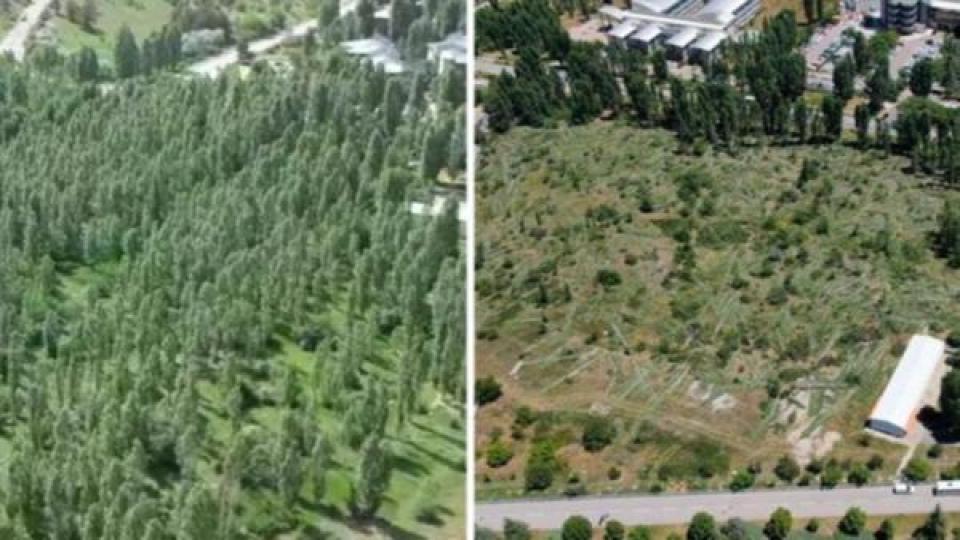 Onlarca kavak ağacının ağacın kesildiği alanda ortaya çıkan manzara korkunç boyutta ve fotoğraflarda büyük bir yeşil alanın yok edildiği görüldü.