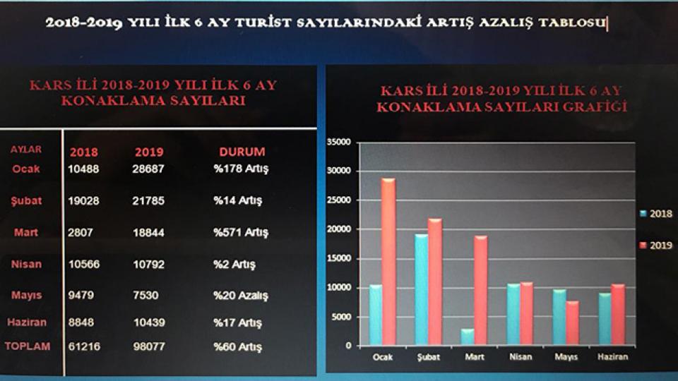 2019 yılının ilk altı aylık konaklama istatistiklerini açıklayan Kars İl Kültür ve Turizm Müdürlüğü, 2019 yılının ilk 6 ayında 98 bin 77 kişinin Kars’ta konaklama yaptığını duyurdu. 2018 yılının ilk 6 ayında bu rakam 61 bin 216 iken 2019’un ilk 6 ayında bu rakam ciddi şekilde artması Karslıları sevindirdi.