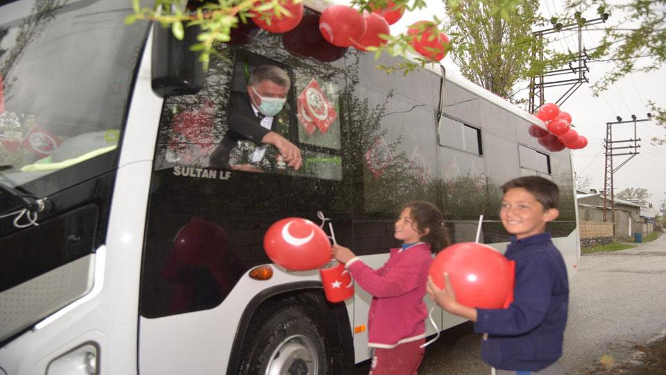 Şoför koltuğuna geçen Belediye Başkanı Yıldız, mahalle mahalle gezerek çocuklara 23 Nisan hediyesi dağıttı.