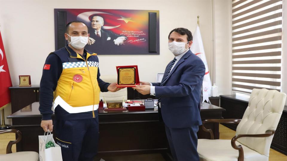 Yılın ‘Ambulans Şoförü’ seçilen Eyüp Demir’i, İl Sağlık Müdürü Uzman Doktor Zakir Lazoğlu makamında kabul ederek, Demir’e plaketi takdim etti