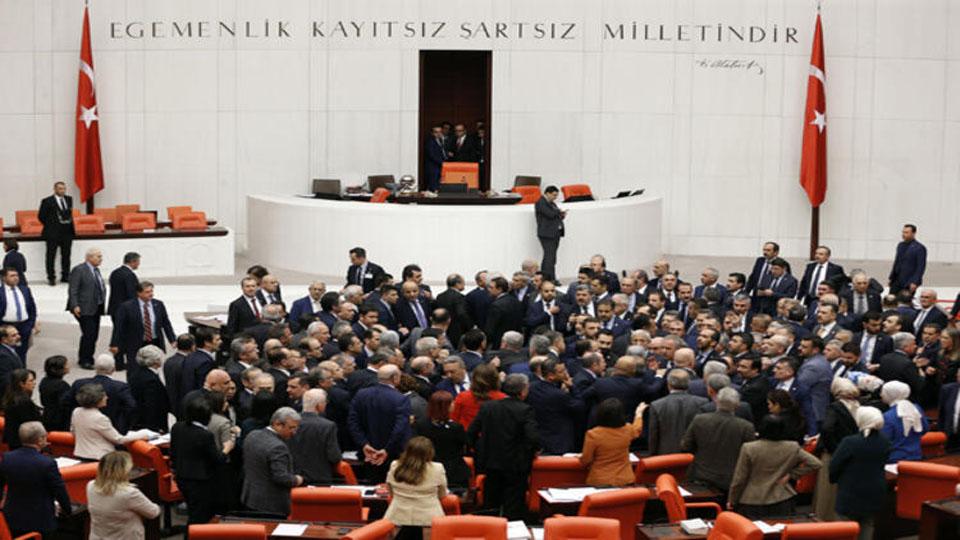 Genel Kurul’da sık sık sıralara vuran milletvekilleri, “Türkiye Büyük Millet Meclisi’nde darbe var”, “Darbeci AKP” ve “Faşizme karşı omuz omuza”, “Darbeci AKP” sloganları attı.