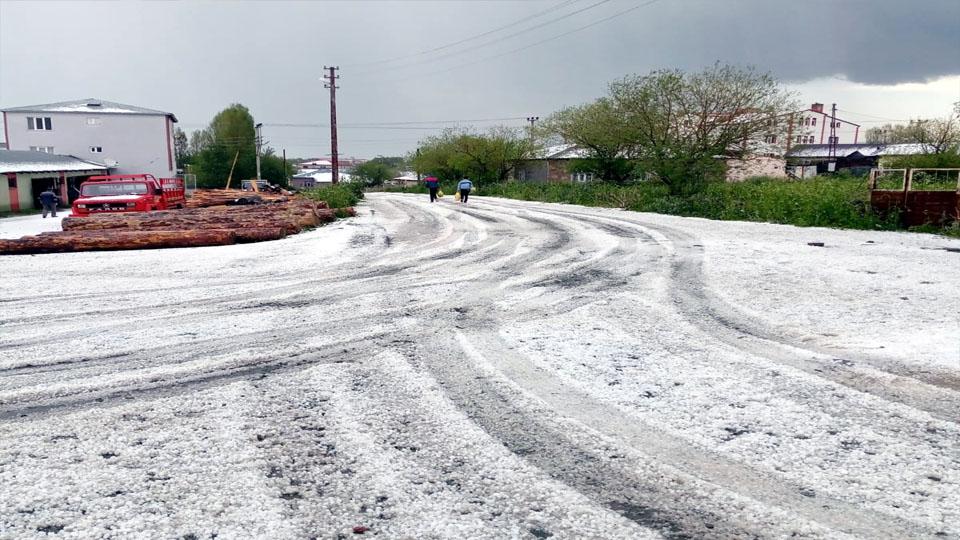 Ardahan’ın Göle ilçesinde etkili olan dolu yağışı ilçeyi beyaza bürüdü.