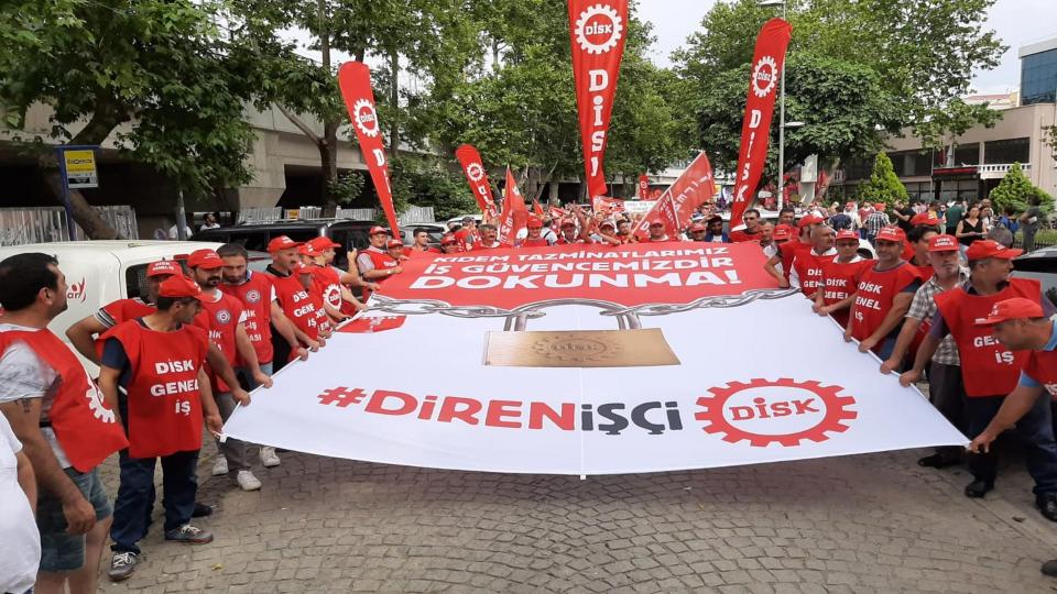 İzmir’de DİSK ve Türk-İş’in Ege Bölge Temsilcilikleri, hükümetin kıdem tazminatını fona dönüştürme girişimi karşı kitlesel basın açıklaması yaptılar. Türk-İş’in basın açıklamasını okuyan Türk-İş İzmir 3. Bölge Temsilcisi Süleyman Yıldırım da, “Kıdem tazminatı işçinin, emekçinin son kalesidir" ifadesini kullandı.
