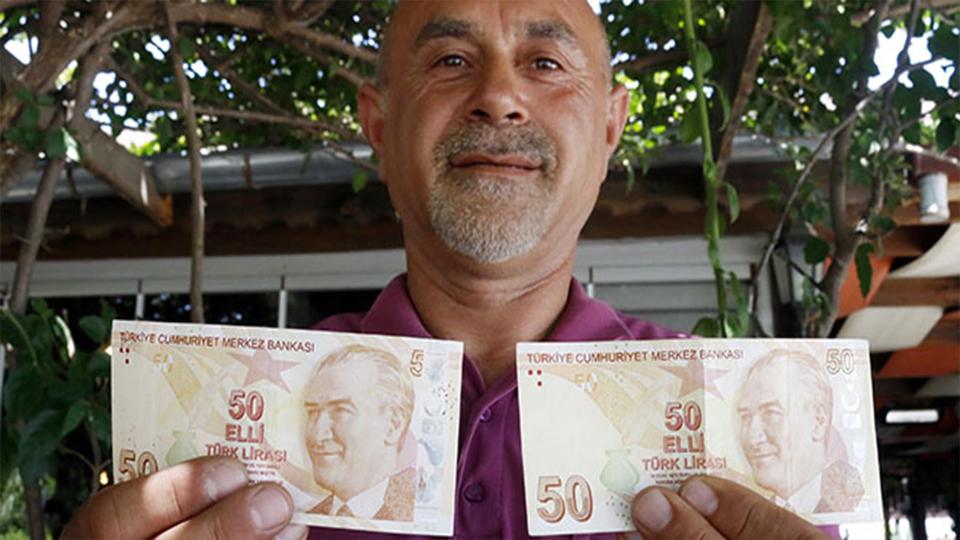 Antalya- Konyaaltı’nda yaşayan Mustafa Şahin’in elinde bulunan 50 TL’lik banknotun ön yüz sağ üst köşesinde ‘50’ yazması gerekirken, basım hatasından dolayı sadece ‘5’ yazıyor.