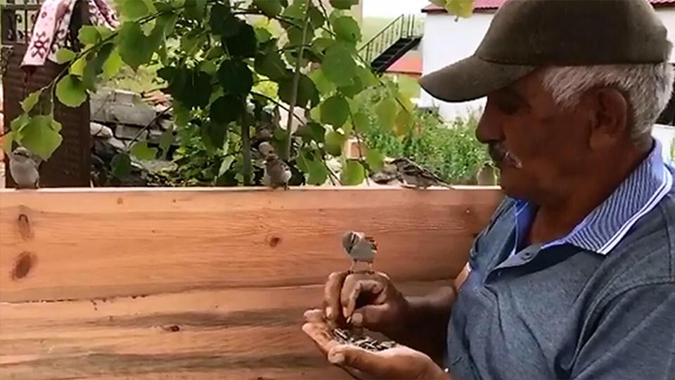Yaz kış sürekli kuşları beslediğini söyleyen İrfan Aydın, “Onlara sevgiyle yaklaşıyorum, onlarda beni seviyor. Benden korkmuyorlar. Gelip elime, omuzuma, kafama konuyorlar. O kadar alıştılar ki benim kırdığım çekirdeklerle besleniyorlar. Her gün bahçemdeki ağaçlara konarak benim yolumu gözlüyorlar. Ben de marketten aldığım çekirdekleri kırarak onlara ikram ediyorum” dedi.
