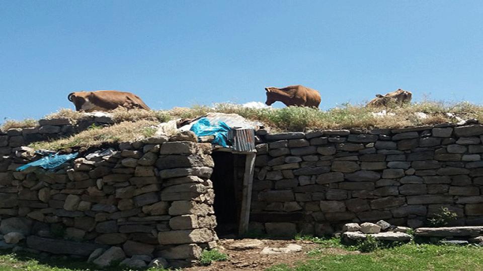 Digor’a bağlı Oyuklu Köyü’nde evin damına çıkan inekleri görenler hayrete düştü. Yaz aylarında akşamları çöle otlama giden inekler, gece çölde kaldıktan sonra gündüzleri sağılmak için yeniden köye geliyor. Damda otlayan inekler, kendilerini görüntüleyen köylülere aldırış etmeden otlamaya devam etti.
