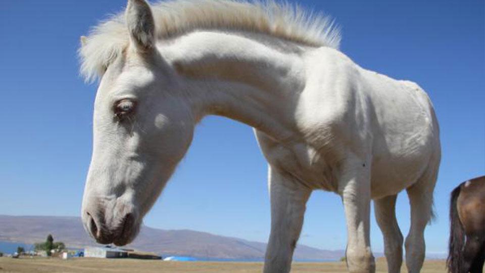 Kars’ın Arpaçay ilçesine bağlı Aydıngün köyünde yaşayan Mustafa Kızıltepe’ye (63) ait siyah renkli at, 3 ay önce albinonun tüm özelliklerini taşıyan bir tay doğurdu.