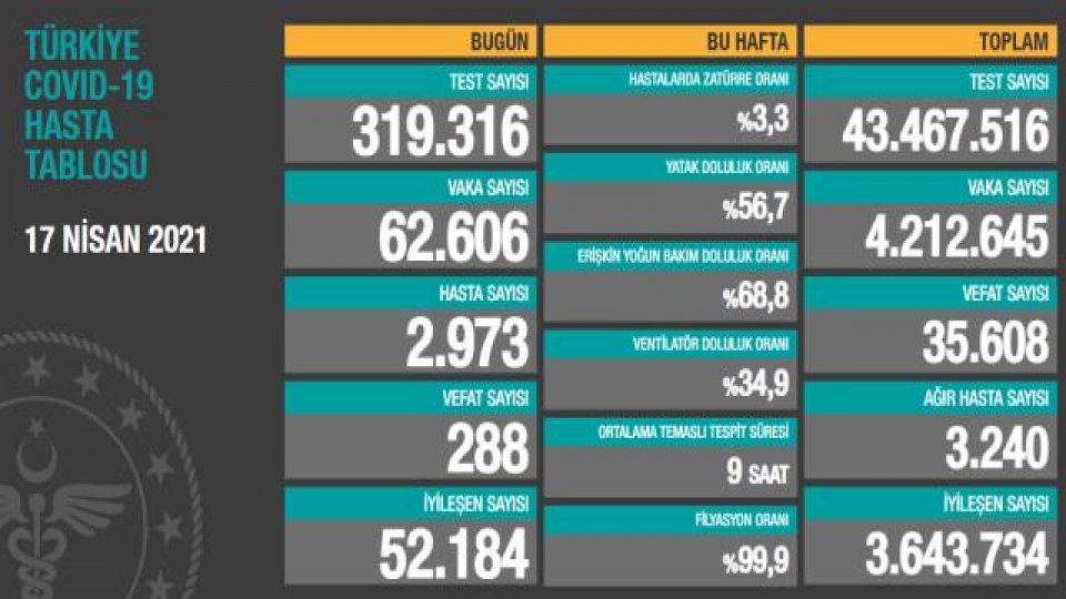 Buna göre, Türkiye'de son 24 saatte 319 bin 316 Kovid-19 testi yapıldı, 62 bin 606 kişinin testi pozitif çıktı, 288 kişi yaşamını yitirdi, hasta sayısı 2 bin 973 oldu.