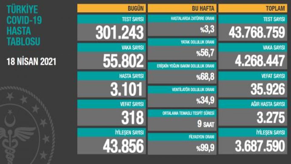 Sağlık Bakanlığı, Türkiye'nin Günlük Koronavirüs Tablosu'nu paylaştı. 18 Nisan'da açıklanan son 24 saatlik verilere göre; 3101'i semptomatik olmak üzere toplam 55 bin 802 yeni vaka tespit edildi. Vefat sayısı ise 318 olarak kayıtlara geçti. Böylece Türkiye'de koronavirüs nedeniyle hayatını kaybedenlerin sayısı 35 bin 926'ya, toplam vaka sayısı ise 4 milyon 268 bin 477'ye yükseldi.