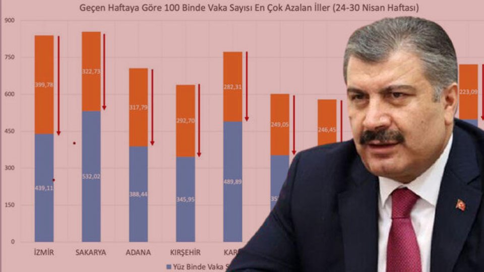 Bakan Koca yaptığı açıklamada;"Geçen haftaya göre 100.000 nüfusa karşılık gelen haftalık vaka sayısı en çok azalan illerimiz; İzmir, Sakarya, Adana, Kırşehir ve Kars."dedi.