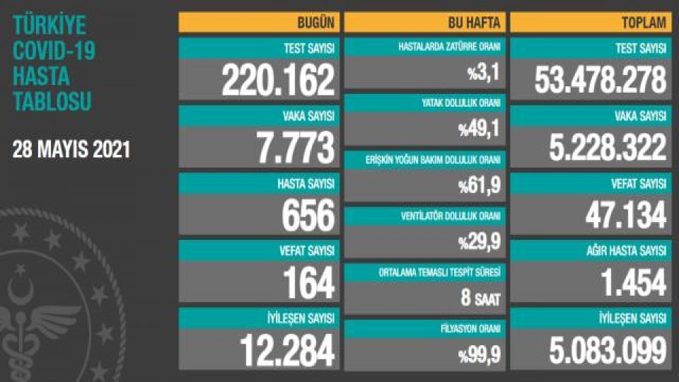Ülkemizdeki koronavirüs vaka ve vefat sayıları düne göre düştü. 28 Mayıs tarihinde açıklanan 24 saatlik verilere göre; 656'sı semptomatik olmak üzere 7 bin 773 yeni vaka tespit edildi. Böylece toplam vaka sayısı 5 milyon 228 bin 322'ye yükseldi. Vefat sayısı ise 164 olarak kayıtlara geçti. İyileşen sayısı da bugün 12 bin 284 oldu.