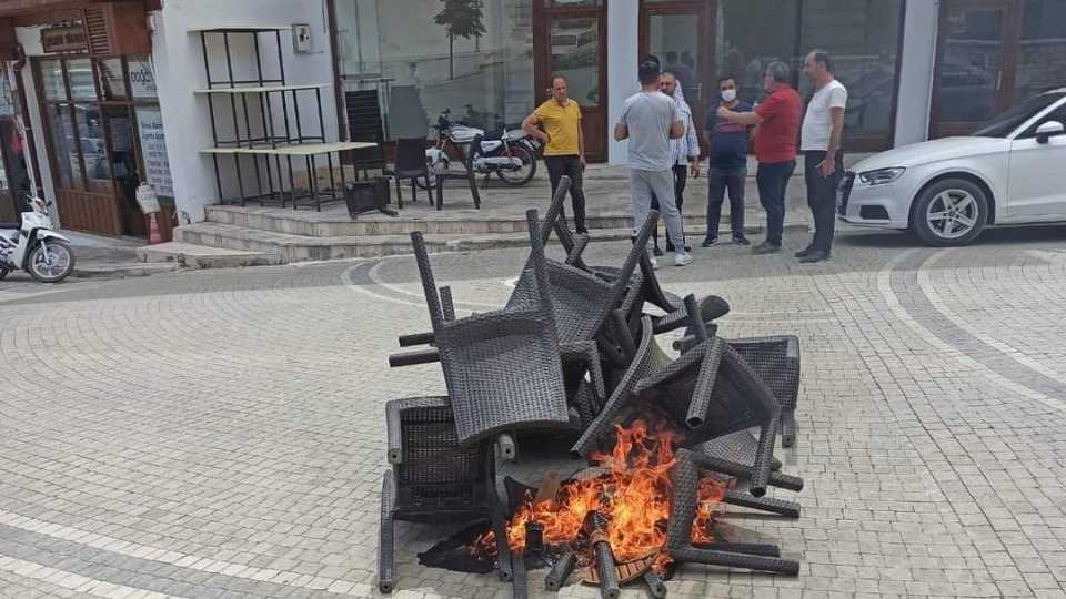 29.05.2021 17:18 0 A+ A A- Antalya’nın Elmalı ilçesinde Çorbacı Yavuz isimli dükkanın sahibi, pandemi yasaklarına ve ekonomik krize isyan ederek yolun ortasına yığdığı sandalyeleri yaktı. Yorumlar (0) Yorum Gönderebilirsiniz Adı Soyadı Yorum