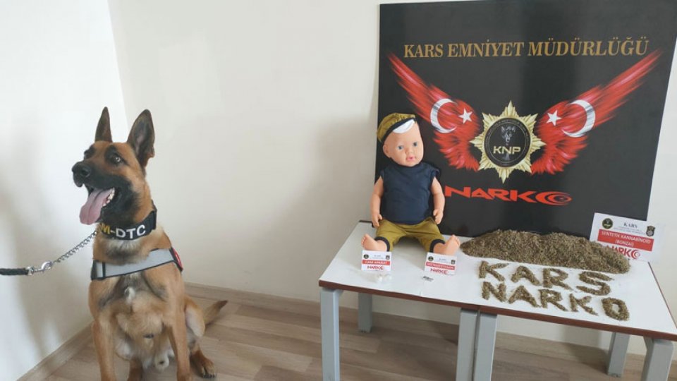Kars İl Emniyet Müdürlüğü Narkotik Suçlarla Mücadele Şube Müdürlüğü ile İstihbarat Şube Müdürlüğü’nün ortaklaşa yaptığı çalışma sonucu kargo yoluyla kente uyuşturucu madde getirileceği bilgisi alındı. Bilgi üzerine polis ekipleri şüpheli şahısları bir süre takibe aldı. Kargodan malzemelerini alan şüpheliler polis ekiplerince durdurularak arandı. Aramada oyuncak bebeğe gizlenmiş 445,8 gram sentetik kannabinoid (Bonzai) maddesi, 0.67 gram metamfetamin maddesi ile 2 adet cam aparat ele geçirildi.