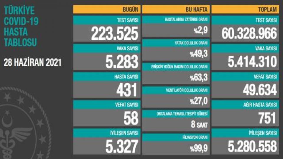 Sağlık Bakanlığı, Türkiye'nin Günlük Koronavirüs Tablosu'nu paylaştı. 28 Haziran'da açıklanan son 24 saatlik verilere göre; 431'i semptomatik olmak üzere toplam 5 bin 283 yeni vaka tespit edildi. Vefat sayısı ise 58 olarak kayıtlara geçti. Böylece Türkiye'de koronavirüs nedeniyle hayatını kaybedenlerin sayısı 49 bin 634'e, toplam vaka sayısı ise 5 milyon 414 bin 310'a yükseldi.
