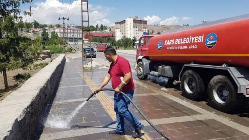 Kars'ta kaldırımlar tazyikli suyla yıkanarak temizleniyor.