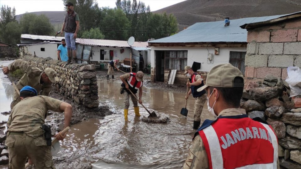 Jandarma ekipleri, selden zarar gören vatandaşların evlerindeki çamurları el arabalarıyla taşıyor, vatandaşların ikametgahlarını yeniden kullanılır hale getirmek için yoğun çaba sarf ediyor.