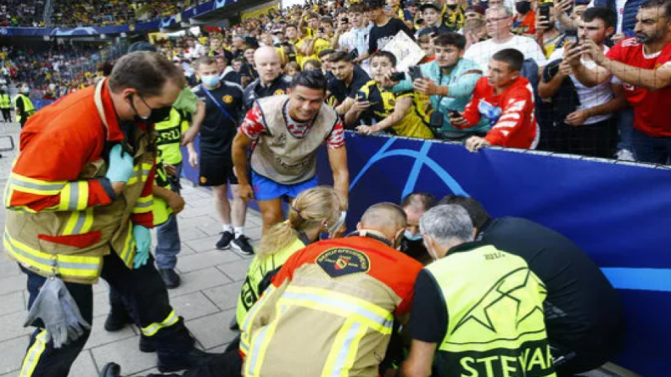 Young Boys-Manchester United maçı öncesinde Cristiano Ronaldo'nun şutunun isabet ettiği bir güvenlik görevlisi baygınlık geçirdi.