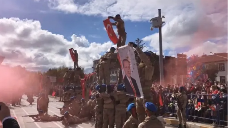 Kastamonu Valiliği tarafından düzenlenen 29 Ekim Cumhuriyet Bayramı kutlamasında Jandarma Komando Eğitim Alayı Komutanlığı’nca gerçekleştirilen gösteride askerler Cumhurbaşkanı Recep Tayyip Erdoğan’ın posterini açtı.