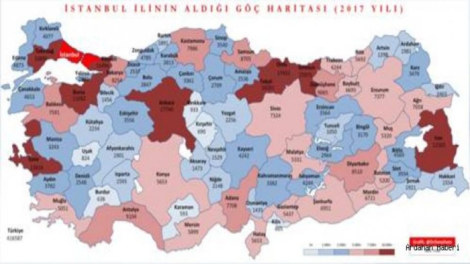 İstanbul 416 bin 587 kişiyle göç almasına rağmen geçtiğimiz yıl 422 bin 559 kişinin İstanbul’u terk ettiği belirlendi. EN AZ GÖÇ KARAMAN’DAN Geçen yıl İstanbul’a göç eden kişi sayısı 15 binden fazla olan iller;15 bin 975 kişiyle Giresun, 15 bin 496 kişiyle de Kocaeli olarak görüldü. Türkiye’nin her yerinden göç alan İstanbul’a, en fazla göç eden diğer iller de 13 bin 816 kişiyle İzmir, 12 bin 505 kişiyle Van, 11 bin 082 kişiyle Bursa, 10 bin 896 kişiyle Tekirdağ şeklinde belirlendi. Buna karşın, İstanbul’a en az göç veren il 593 kişiyle Karaman oldu. Karaman’ı 605 kişiyle Kilis, 638 kişiyle Burdur, 690 kişiyle Kırşehir izledi.