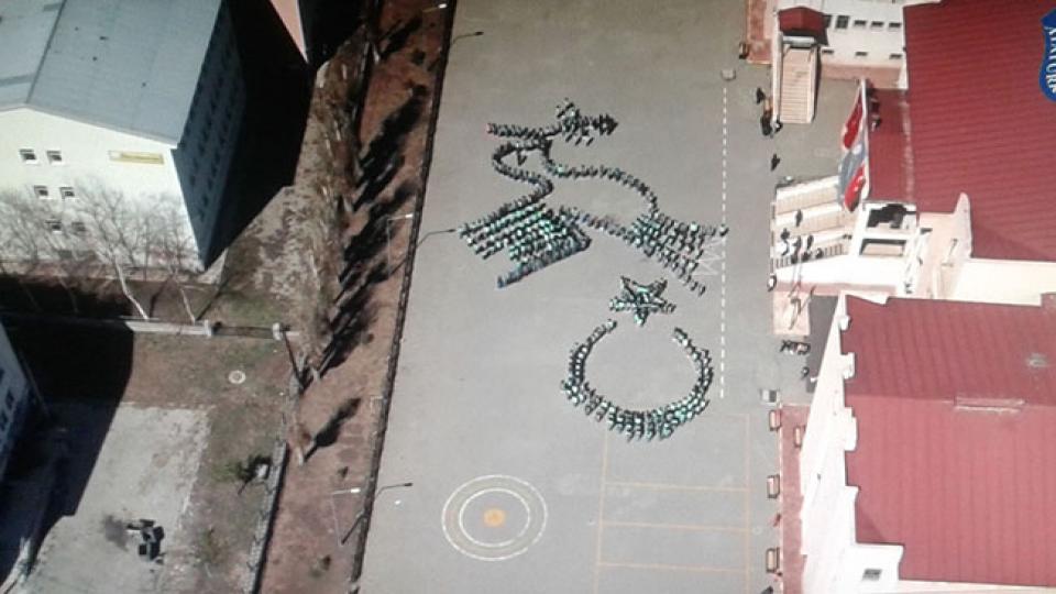 600 öğrencinin bir araya gelerek okul bahçesinde yaptığı anlamlı figür, havadan görüntülendi. Öğrencilerin ‘Zeytin Dalı’ ve ‘Ay Yıldız’ figürünü oluşturması Dronla an be an kaydedildi.