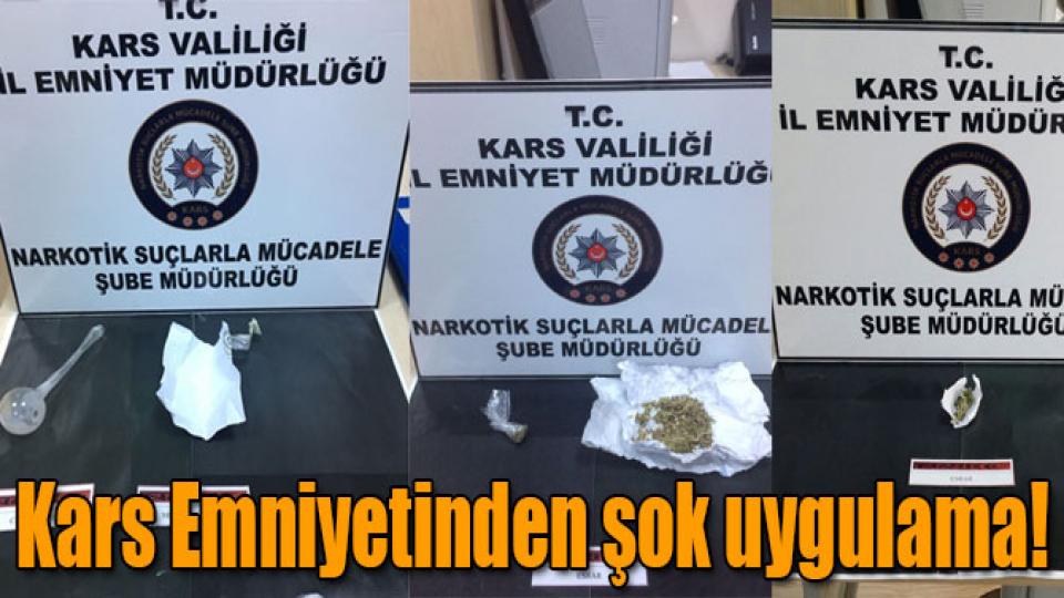 Kars'ta polis tarafından farklı noktalarda yapılan şok uygulamalar neticesinde 5 kişiden toplam 12.73 gram uyuşturucu olduğu değerlendirilen maddeler ele geçirildi. Uyuşturucu maddeler imha edilmek üzere muhafaza altına alınırken, 5 şahıs hakkında ise TCK-191 (Kullanmak için uyuşturucu veya uyarıcı madde satın almak, kabul etmek veya bulundurmak) suçu kapsamında adli işlem başlatıldı. Olayla ilgili tahkikat devam ediyor.
