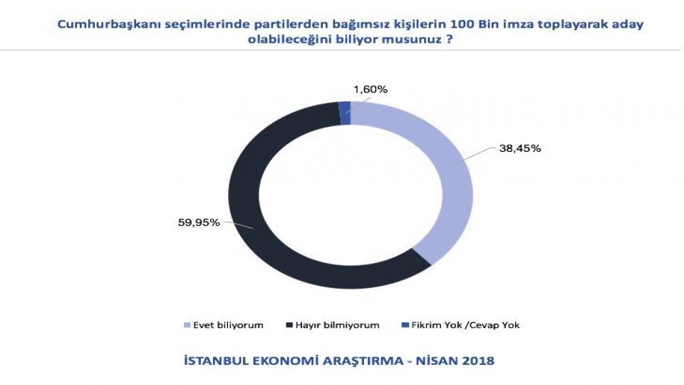 İstanbul Ekonomi Araştırma’nın yaptığı ankete göre toplumun yüzde 60’ı, 24 Haziran’daki seçimlerde partilerden bağımsız kişilerin, 100 bin imza toplayarak cumhurbaşkanı adayı olabileceğinden haberdar değil.