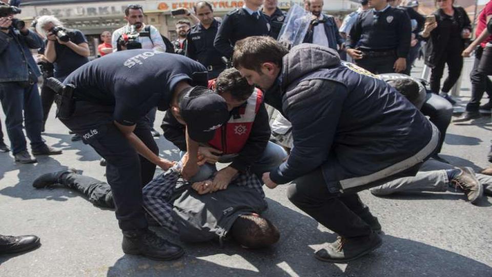 Sıraselviler Caddesi’nden Taksim Meydan’a slogan atarak yürüyen biri kadın dört kişi gözaltına alındı. Gözaltına alınanlar‘Yaşasın 1 Mayıs’ yazılı pankart taşıyordu.