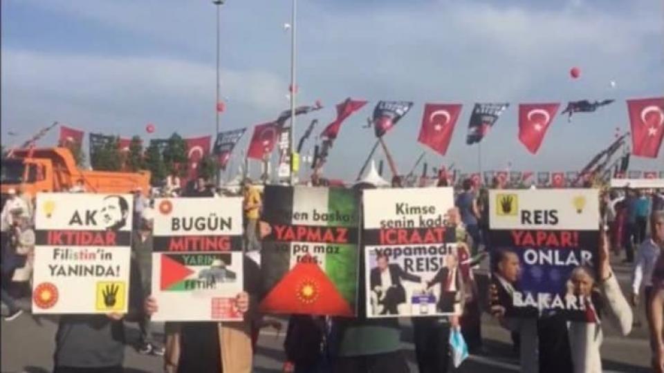Cumhurbaşkanı Tayyip Erdoğan’ın çağrısıyla dün Yenikapı’da gerçekleşen ‘Zulme Lanet Kudüs’e Destek’ mitingine katılan beş Saadet Partili (SP) genç, taşıdıkları beş farklı dövizle bir mesaj verdi. Mitingi ‘trolleyen’ beş gencin taşıdığı dövizler yan yana gelince ortaya “İktidar miting yapmaz icraat yapar” mesajı çıktı.