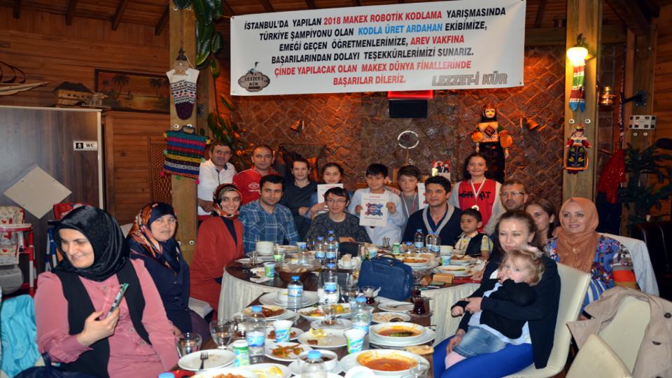 Ardahan Eğitim Vakfı ve Milli Eğitim Müdürlüğü işbirliğiyle 23 Şubat ilkokulunda açılan Robotik Kodlama Atölyesinde tasarladıkları “Robothan” Projesiyle Türkiye birincisi seçilen ve ülkemizi Çin’de temsil edecek olan öğrencilerin ailelerine ve öğretmenlerine iftar yemeği veren Lezzet-i Kür Restaurant & Cafe’nin sahibi Kadim Yılmaz’dan anlamlı destek.